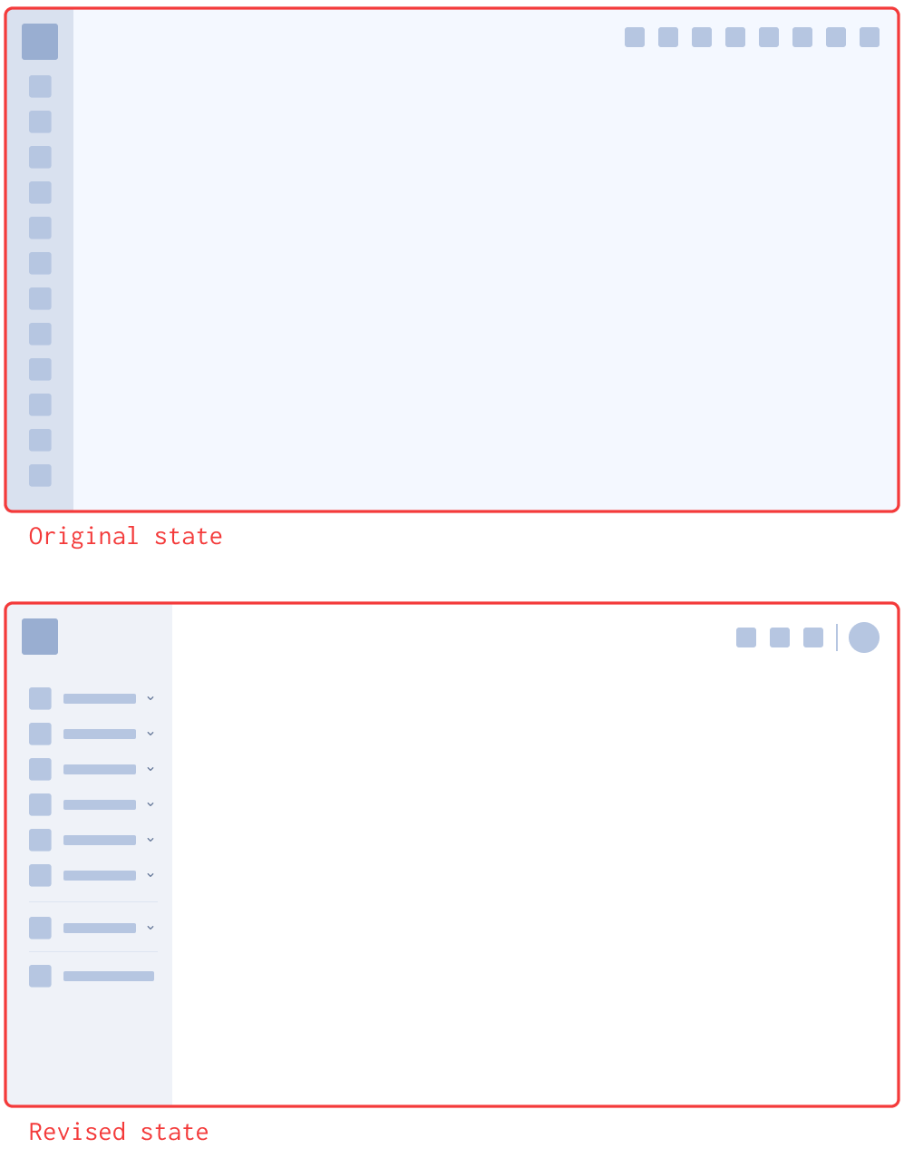 Items are categorized using natural user groupings and functional buckets. Account-level actions are moved to the header, and redundant actions removed.